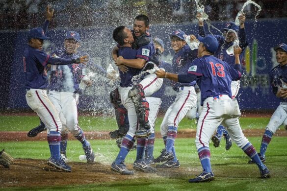 五局上黃天賜敲安、靠劉承佑犧牲觸擊推進上二壘,曾聖安一壘安打送上三壘,最後靠柯敬賢左外野高飛犧牲攻下第3分。下半局日本1出局後,境亮陽、濱本遙大、徳丸快晴接連敲安攻佔滿壘,石塚裕惺敲出滾地球形成雙殺、留下殘壘,中華隊守住領先。
