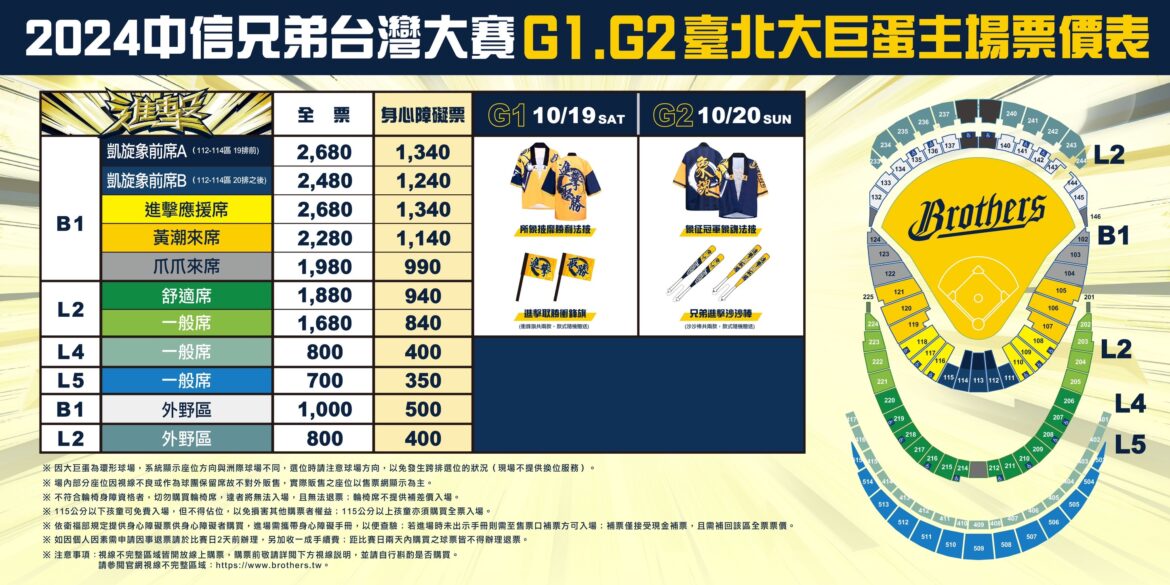 中信兄弟2024總冠軍賽分為臺北大巨蛋與臺中洲際雙主場,賽事門票將不分全半票,僅保留身心障礙票。臺北大巨蛋B1-L2內野票價為1,680-2,680元, L4-L5一般席座位則是700-800元,外野1,000-800元。兩天的B1-L2內野票將獲得G1-10/19(六)贈送「所象披靡」勝利法披,以及兄弟進擊取勝衝鋒旗,G2-10/20(日)則是贈送「象征冠軍」象魂法披,以及兄弟進擊沙沙棒。