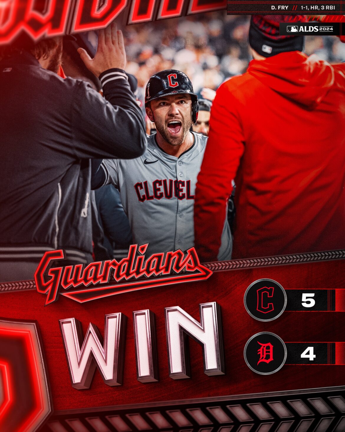 MLB季後賽美聯分區系列賽G4,底特律老虎今(11)日主場迎戰克里夫蘭守護者,兩隊在前5局戰成2:2平手,7局上守護者1分落後,代打上場的弗萊(David Fry)一棒掃出2分砲,助守護者超前比分,最終守護者靠著Fry的逆轉2分砲,以5比4擊敗老虎,雙方系列賽戰成2:2平手,將在台灣時間週六進行G5生死戰。