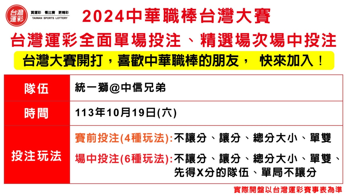 台北大巨蛋將在 10/19(六)迎來首次的中華職棒台灣大賽,由年度勝率第一的中信兄弟迎戰季後挑戰賽 3 勝 1 敗晉級的統一獅。台灣運彩提供台灣大賽全面單場投注、精選場次提供場中投注,共同掀起台灣大賽熱潮。10/19 日(六)台灣大賽首戰,台灣運彩預計提供單場及場中投注,並有6 種玩法,包含賽前投注不讓分、讓分、總分大小、單雙等4 種投注玩法,以及場中投注的不讓分、讓分、總分大小、單雙、先得 X 分的隊伍、單局不讓分等6 種玩法供消費者選擇,等你來投注喔!