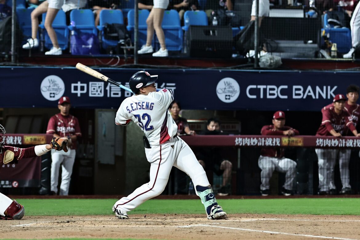 前4局沒太多攻勢的樂天桃猿,直到5局上半,才從王宇翔(樂天借將)手中攻下第1分,更是在6局上半利用3支安打及1次保送,將比數扳成3比3平手。