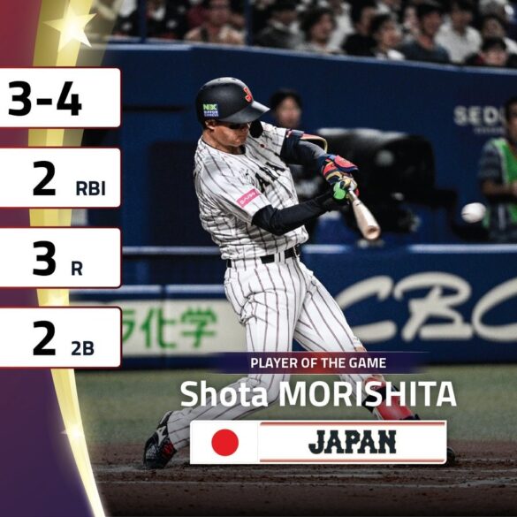 森下翔太昨雖未開轟,但在2比0領先的第3局,擊出游擊內野安打後,為日本隊跑回第3分;7局5比3領先,他擔任首名打者,再敲出左外野二壘安打為日本隊開啟得分希望,之後在大學前輩牧秀悟的推進下回本壘得到日本隊第6分;8局兩出局、一三壘有人,他再擊出左外野2分打點二壘打。