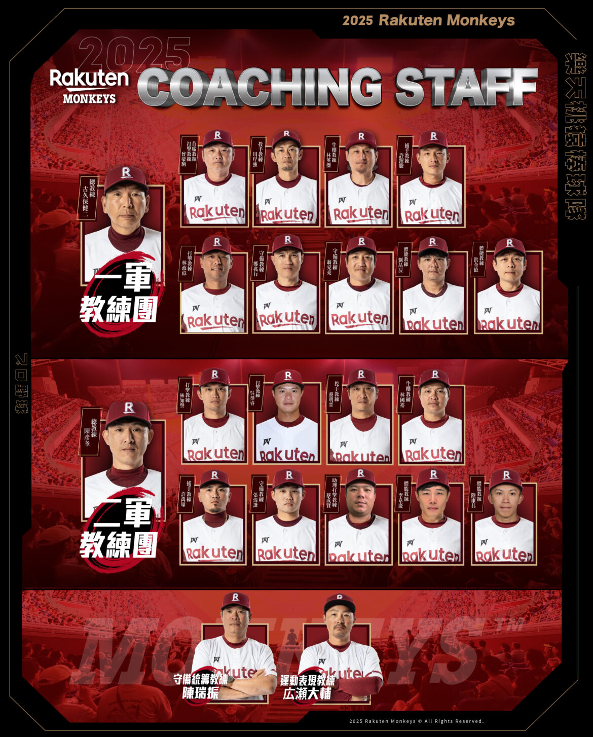 2025年Rakuten Monkeys教練團正式成軍,全新賽季同樣由古久保健二執掌兵符,二軍總教練由陳彥夆接任,原二軍總教練曾豪駒擔任一軍首席兼打擊教練;樂天桃猿將在1月12日展開以年輕球員為主的重訓營,2月2日在嘉義縣立棒球場展開春訓,全猿齊心備戰2025賽季。