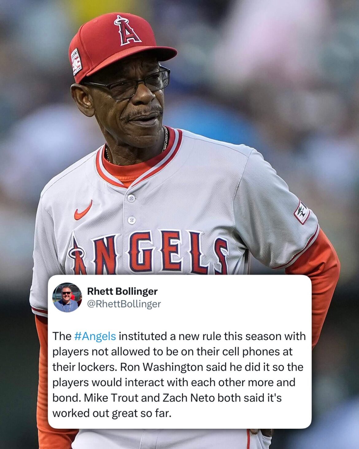洛杉磯天使隊本季推出新規定,球員在更衣室內不得使用手機。總教練華盛頓(Ron Washington)希望透過此舉提升球隊凝聚力,鼓勵隊員更多面對面交流,而非沉迷於手機世界M他強調,這不是一種懲罰,而是為了讓大家專注於棒球,回歸純粹的團隊互動。