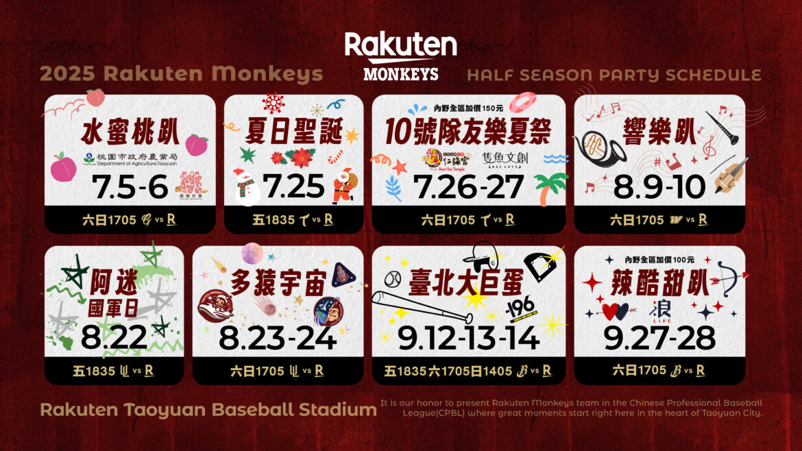 一年一度樂天集團日在7月25日與大家見面,球團也精心打造「夏日聖誕」主題,樂天女孩將換上特別造型,帶領大家體驗盛夏版的奇幻聖誕派對。「10號隊友樂夏祭」7月26、27日熱情登場,內野全區將贈送球衣,更有不分勝負的賽後煙火秀,邀請10號隊友一起穿上球衣享受樂天桃猿的夏夜晚風。