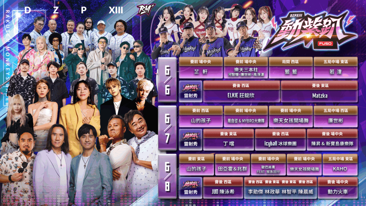 今年的動紫趴卡司將為球迷帶來全方位的音樂饗宴。開幕日由新生代全方位藝人ELKIE莊錠欣、原住民雷鬼靈魂唱作歌手Matzka打響第一聲,並由推進隊長籃籃攜手神秘嘉賓於二局下加碼演出,讓現場熱度持續飆升。接下來,6月7日將迎來創作才子周自從攜MyBro大樂隊全場合唱,復古浪漫的icyball冰球樂團、全民情歌天后丁噹以及氣氛製造機陳昇與新寶島康樂隊接力登場,讓全場沉浸在音樂的薰陶之中。壓軸日更是星光閃耀,山的孩子樂團依舊陪伴全場,歐巴尚青與猴系因仔首次公開合作曲及田亞霍與兆群帶來全新創作,接著入圍金曲3獎項的JUD陳泳希強勢登場,最終由動力火車以磅礡演出引爆最終高潮,全場氣氛沸騰!