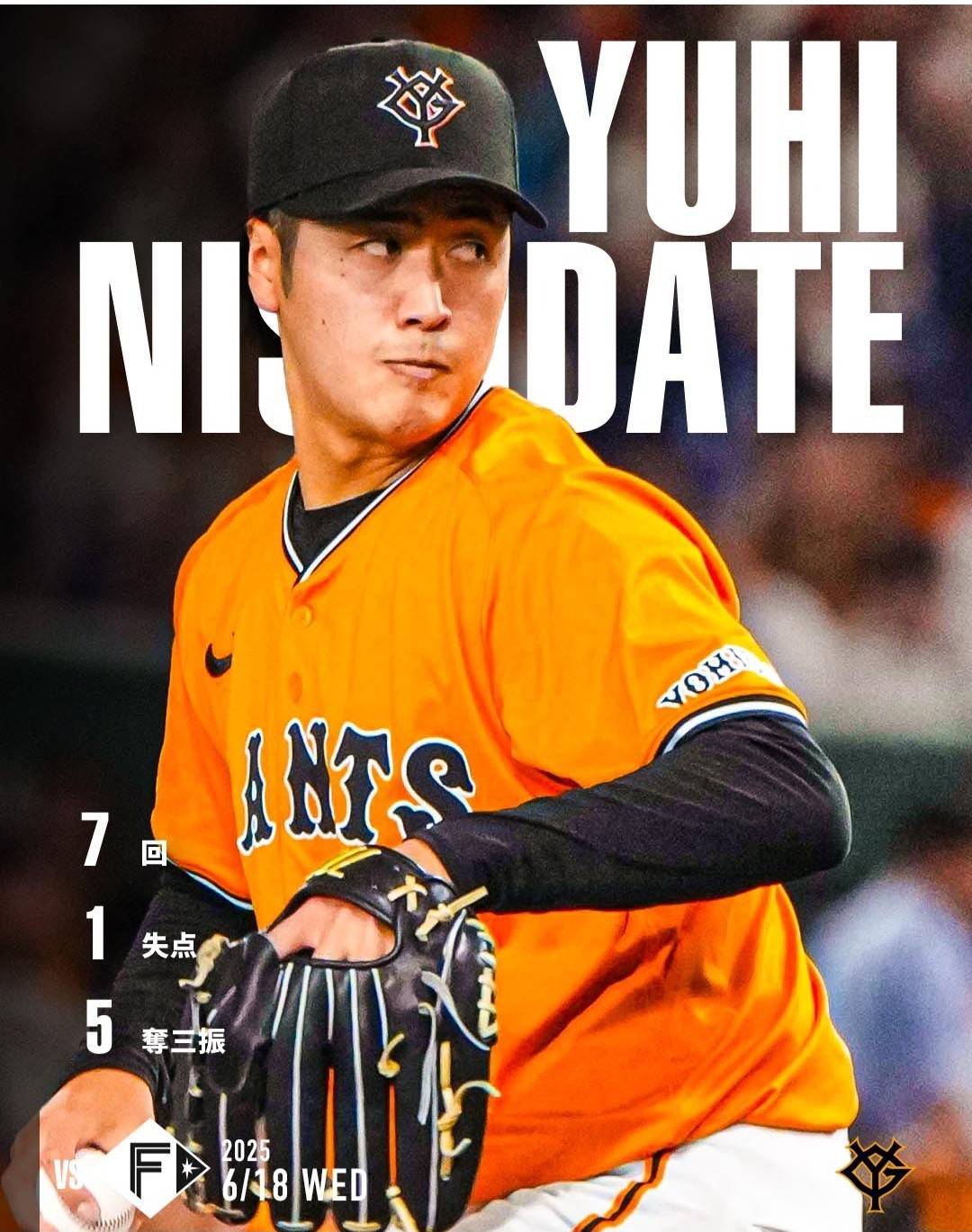 巨人推出2023選秀第1指名西舘勇陽先發,他在去年升上一軍,出賽28場僅1場先發,防禦率3.82,但被打擊率僅2成08,今年出賽7場,2場先發,2勝0敗,防禦率2.57,被打擊率2成31,WHIP由去年1.17降至1.05。日前交流戰對軟銀、火腿2支火力強大的球隊,都能投出7局優質先發並拿下勝投。