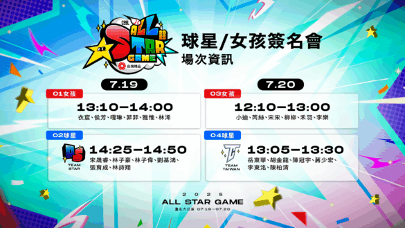 球星女孩簽名會將分別於明星賽兩日舉行,7月19日登場的是TEAM STAR球星簽名會,參與的球星包括宋晟睿、林子豪、林子偉、劉基鴻、張育成、林詩翔,啦啦隊女孩則由衣宸、侯芳、嘎琳、菲菲、雅惟、林浠參加首日活動。7月20日輪到TEAM TAIWAN亮相,球星陣容包含岳東華、胡金龍、陳冠宇、蔣少宏、李東洺、陳柏清,啦啦隊女孩則由小迪、芮絲、宋宋、柳柳、禾羽、李樂在簽名會參與第二日活動。