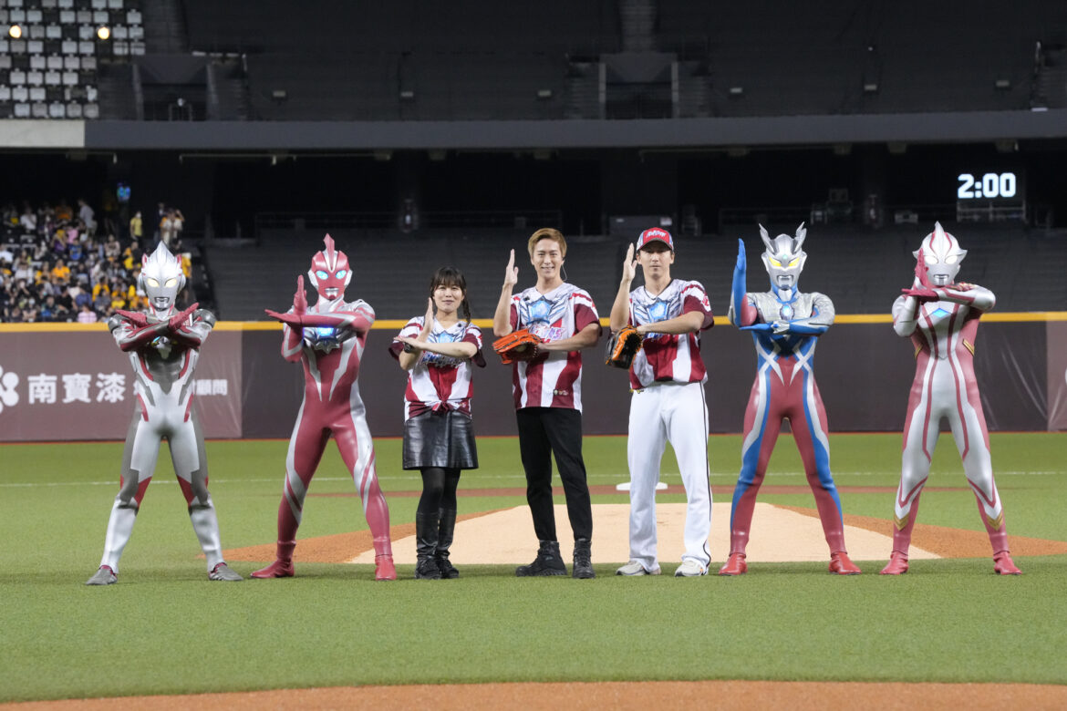 今日賽事開球嘉賓特別安排Voyager中的TAKERU擔任,而捕手安排髙塩將樹擔任,髙塩將樹非常開心可以擔任本次開球捕手,特別在棒球上親自手繪超人力霸王圖案,送給TAKERU的一份小驚喜,與傑洛、梅比斯、奧米加、X一起為賽事開出絕佳好球,髙塩將樹更擺出超人力霸王的招牌動作合影。開球結束後,TAKERU再度踏上投手丘,將投手板上的塵土擦拭乾淨,向內外野敬禮,展現對球場和賽事的尊敬與禮貌,也令球迷印象深刻。