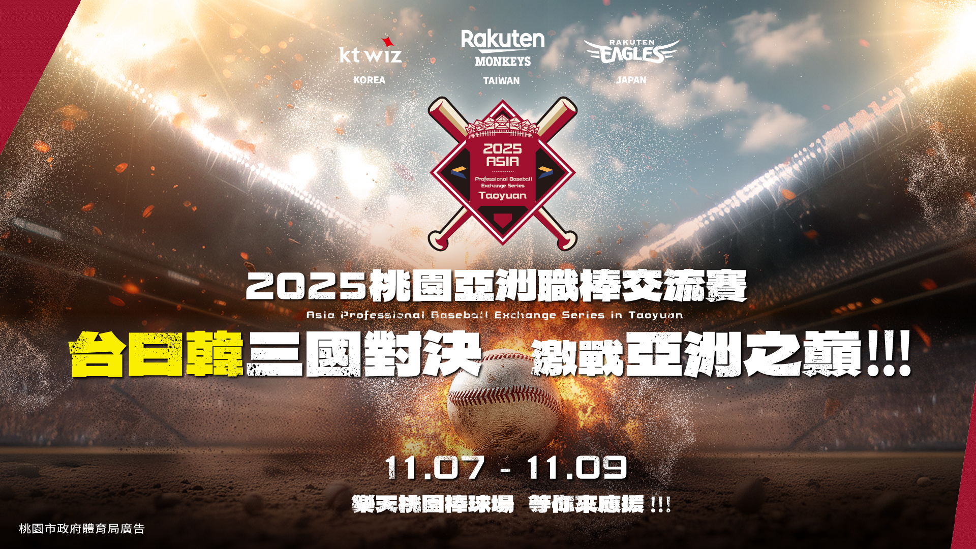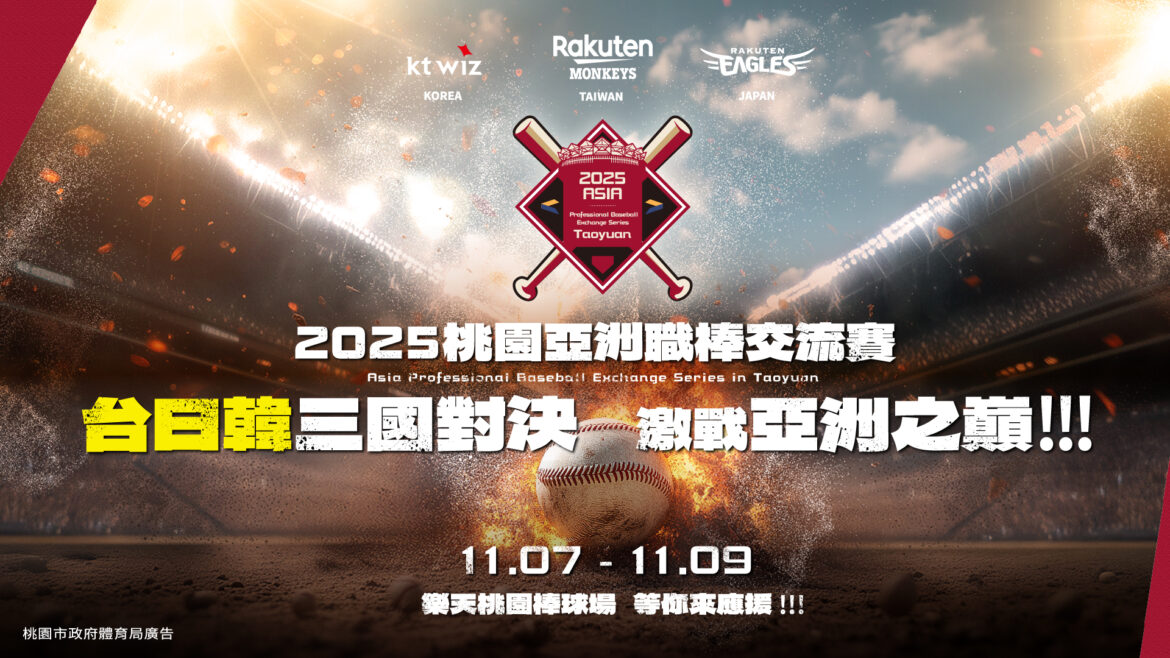 2025 亞洲職棒交流賽將於 11 月 7 日至 9 日在樂天桃園棒球場登場,由桃園市政府主辦,攜手台灣樂天桃猿、日本東北樂天金鷲與韓國 KT wiz(KT 巫師),三支曾在各自聯盟封王的冠軍球隊首度齊聚台灣,帶來最高水準的跨國對決。