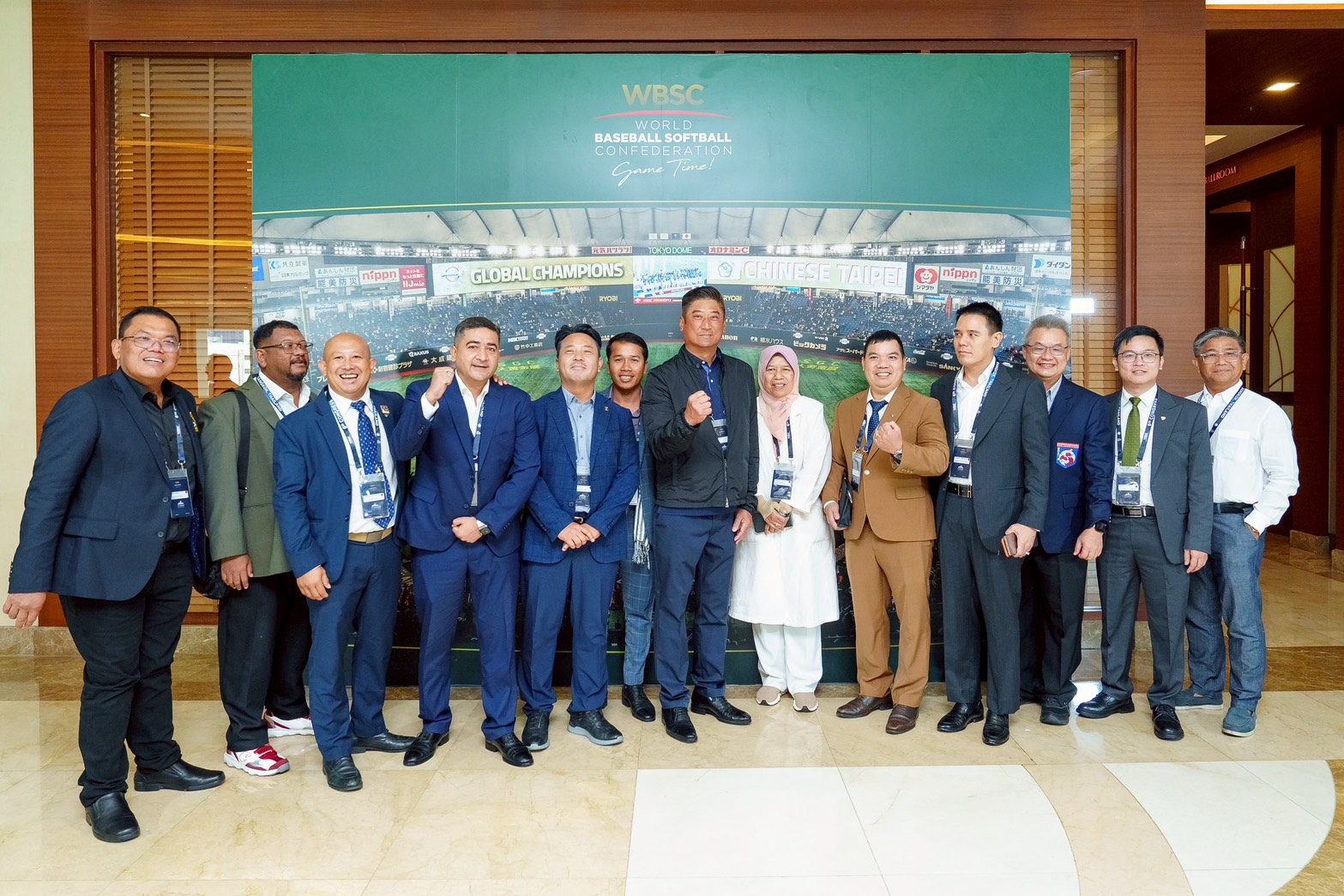 值得一提的是,BFA大會會場的迎賓大廳特別設置棒球、壘球、球棒的設計擺設,大會會場旁也懸掛國際棒球賽事的大幅照片背板,正是中華隊去年11月在東京巨蛋P12奪冠的歷史性畫面;BFA會員大會的中場休息空檔,亞洲各國會員代表爭相與辜仲諒會長合照,並一起喊出「Asian Power」的口號。
