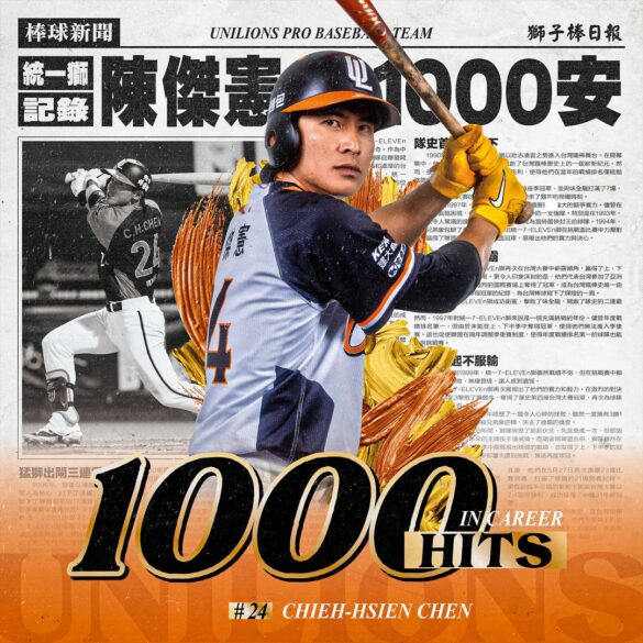 統一獅今(25)日台南主場面對中信兄弟,陳傑憲擔任先發第三棒,首打席就敲出安打,成功達陣個人生涯第1000支安打,也成為中職史上第28位「千安俱樂部」的成員,也是隊史最快完成千安里程碑的球員。