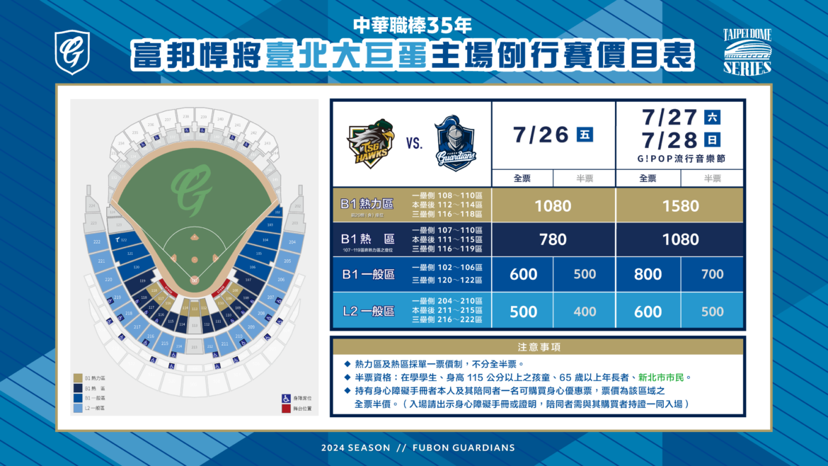 富邦悍將7月26日(五)~7月28日(日)再度前往臺北大巨蛋進行系列賽,其中包括在7月27、28日首度移師大巨蛋舉辦的「G!POP流行音樂節」,悍將在今天公布系列戰票價及購票時程,將從7月9日(二)起開放會員優先購票,7月12日(五)中午12點30分起全面開賣!