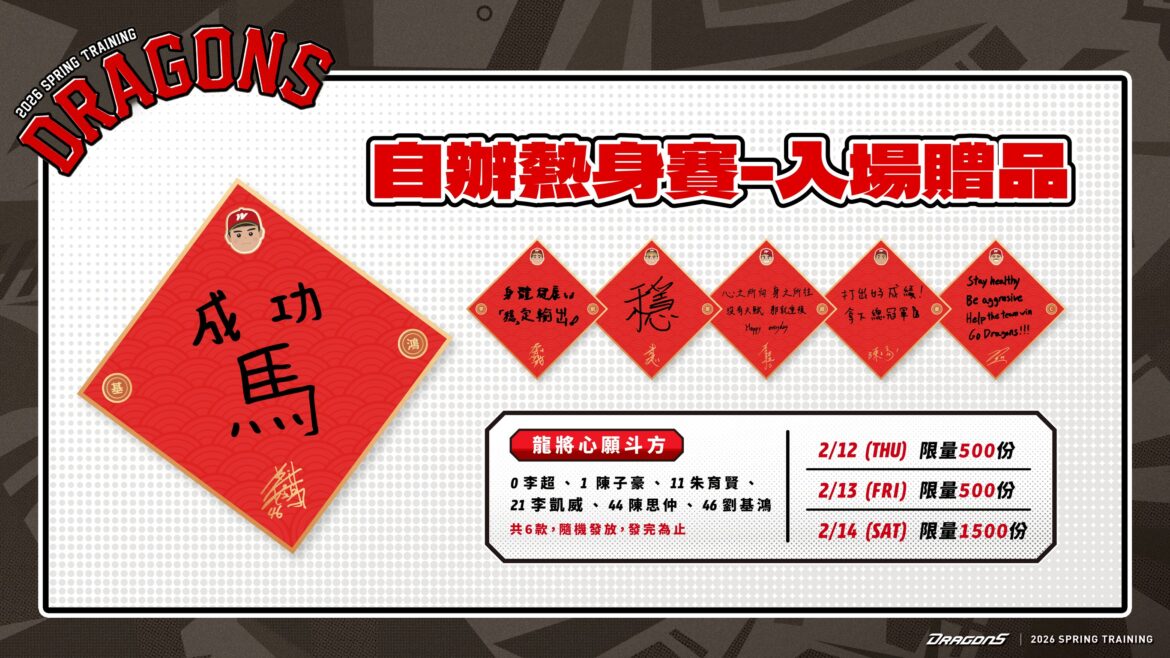 春節前場次(2/12-2/14)將發放「龍將心願斗方」共6款,包含李超、陳子豪、朱育賢、李凱威、陳思仲、劉基鴻款式。平日場每日限量500份,假日場(2/14)限量1,500份,球迷朋友可把握機會進場收藏。春節後場次(2/24、2/26)則推出「球員影像貼紙組」共2款,分別為春訓視覺系列款與人氣球員韓風款,提供球迷收藏。