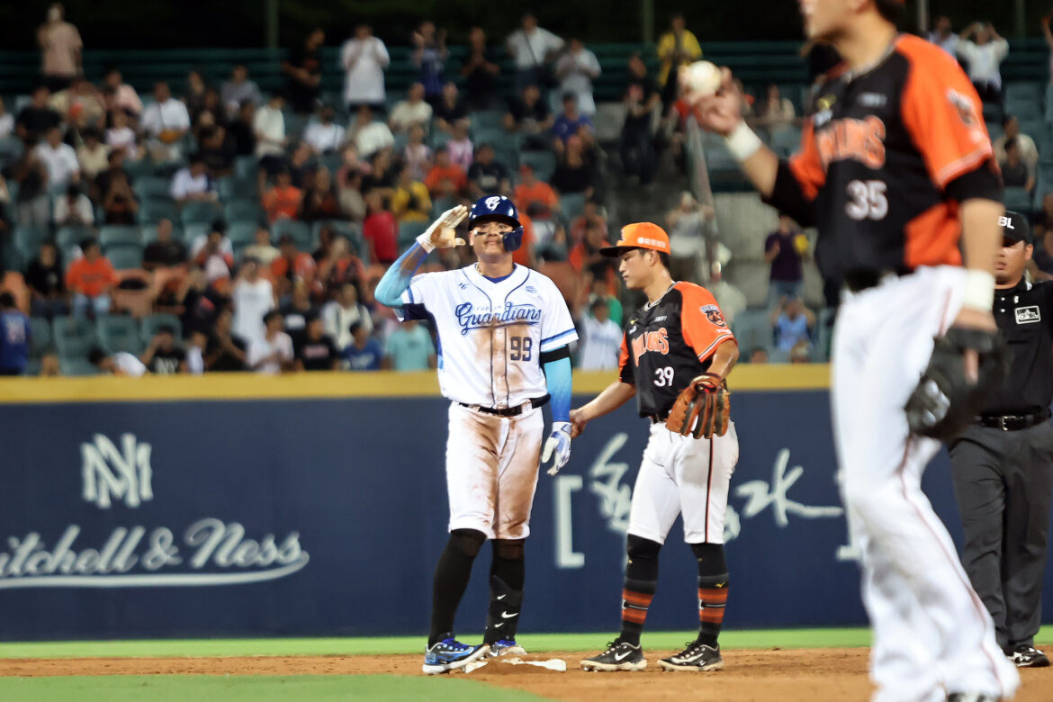 42歲的潘威倫預定在今年球季結束後退休,下個月滿29歲的張育成上場先向他致敬,「畢竟他是大前輩,我是新人,這是小老弟該做的,」嘟嘟的137公里速球剛好進到他要的位置,順手就敲安打,「我也蠻幸運的,可以對到他,而且中華職棒首安可以從他手中打出來。」