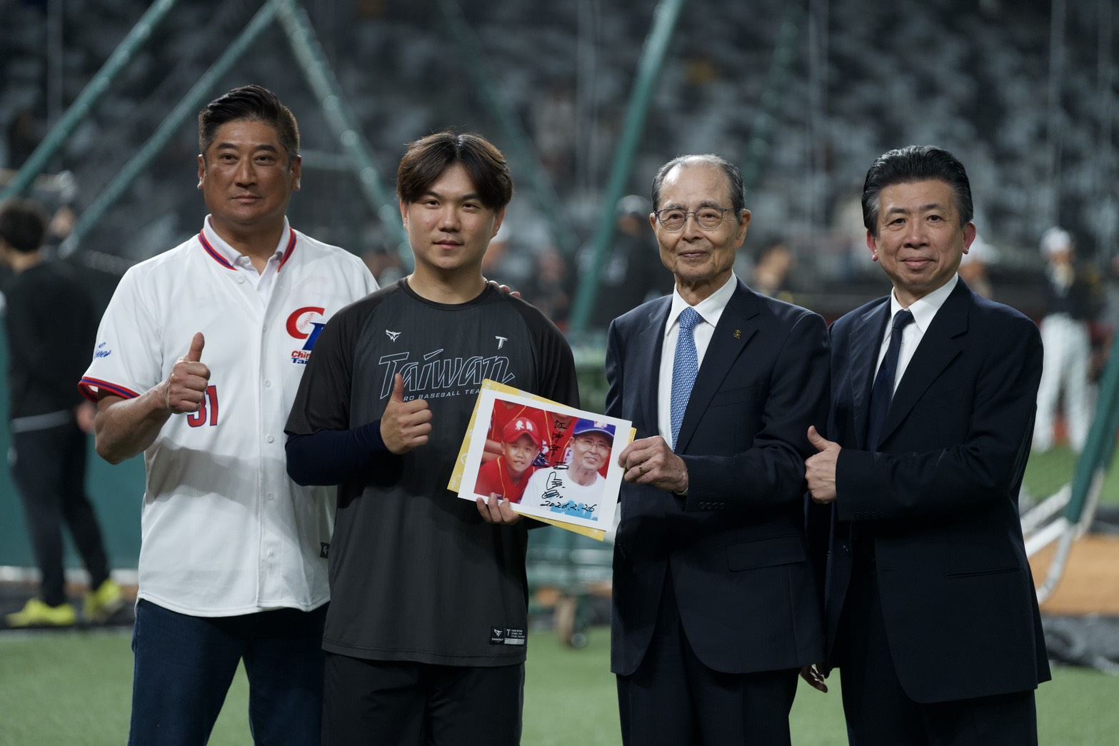 2026年第6屆世界棒球經典賽即將於3月5日開打,中華隊今(26)日在台北大巨蛋,與日本職棒軟銀隊進行交流賽,賽前傳奇全壘打王王貞治特別到場觀看練習。中華隊游擊大將江坤宇也把握這難得機會,帶著一張珍藏多年的國小合照與王貞治相認,成功獲得簽名並圓了「跨時空」的夢。