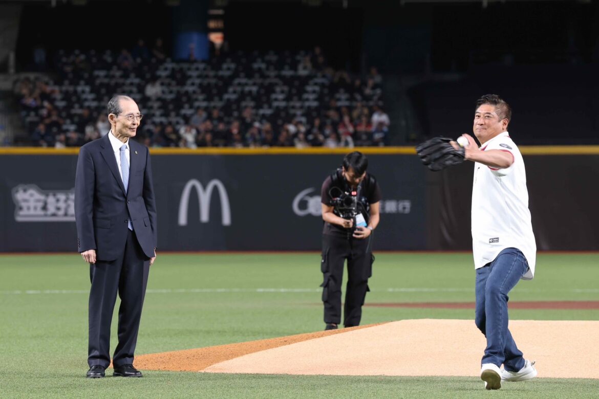 「世界全壘打王」王貞治先生在中華民國棒球協會(簡稱「中華棒協」)理事長辜仲諒力邀之下再度訪臺,偕同中華棒協理事長辜仲諒、臺北市體育局局長游竹萍、中華職業棒球大聯盟會長蔡其昌,以及中國信託銀行資本市場執行長許俊仁參加開球儀式。