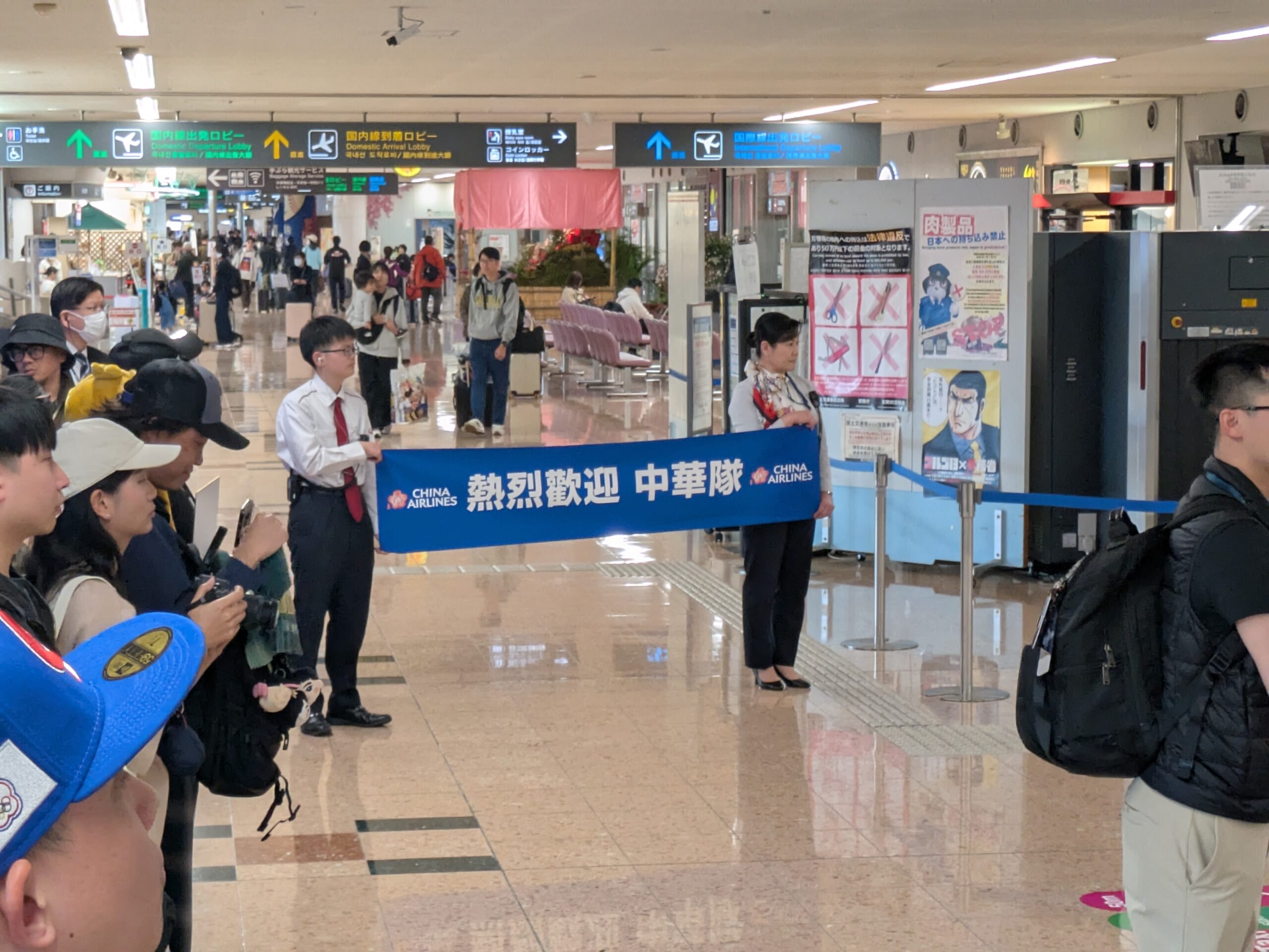經典賽中華隊在今天下午搭華航包機從桃園飛抵日本宮崎,落地後出關的時間大約下5點40分,現場近20位球迷熱情接機,「費仔」費爾柴德(Stuart Fairchild)親切地停下來配合簽名,一旁還有球迷大喊,「安可,我有你的全壘打球,可以幫我簽嗎?」林安可聽到喊聲,也很高興地完成對方心願。
