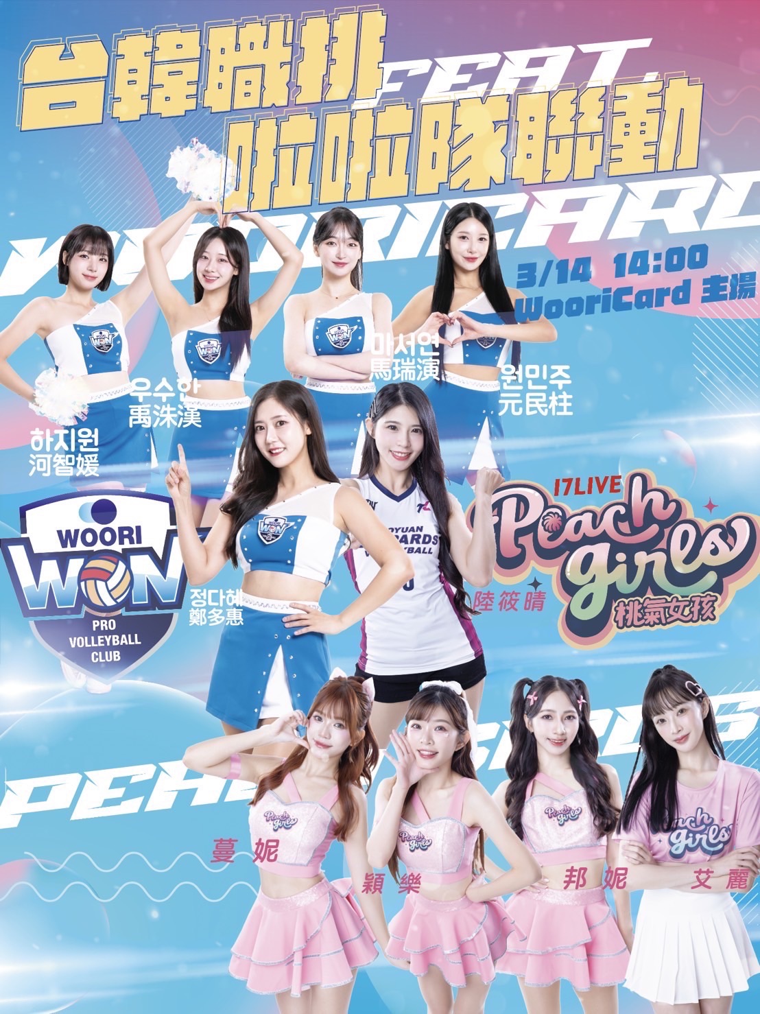 桃園雲豹飛將職業排球隊專屬啦啦隊「17LIVE桃氣女孩」(Peach Girls)正式踏出國際舞台!應韓國首爾友利排球隊(Woori WON)邀請,桃氣女孩將於 3月14日 前往韓國首爾獎忠體育館(Jangchung Arena),在韓國職業排球聯賽賽事中進行跨國應援演出,這不僅是桃氣女孩成立以來 首次跨國演出,同時也是台韓職業排球啦啦隊之間難得的交流合作,預計將為現場球迷帶來熱情四射的跨國應援盛宴。