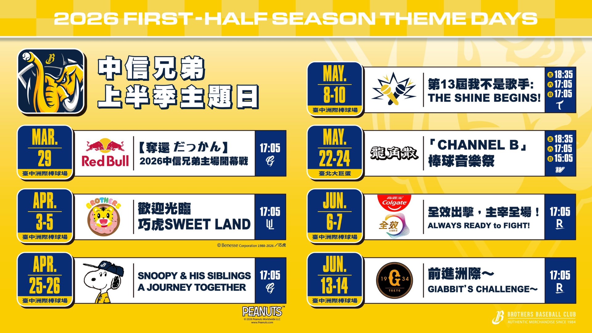 上半季主題週消息釋出後引起熱烈迴響,其中 4/3-4/5「歡迎光臨巧虎 SWEET LAND」 將是巧虎IP首度與職棒聯名,打造小孩的天堂、大人的回憶;4/25-4/26 則由 Snoopy 與他的兄弟姐妹接棒報到,讓國際級IP聯名在四月份接力登場,打造全齡球場嘉年華!五、六月則鎖定核心球迷與跨界粉絲,包含第 13 屆 「我不是歌手:THE SHINE BEGINS!」,以及六月份與樂天桃猿對戰的 「全效出擊」 與讀賣巨人聯名 「前進洲際~GIABBIT’S CHALLENGE~」。