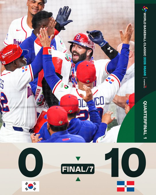 經典賽8強戰首戰,南韓對上多明尼加,7局下靠著威爾斯(Austin Wells)的再見3分砲,以10比0提前結束擊敗南韓,4強戰將出戰美國和加拿大的勝隊。