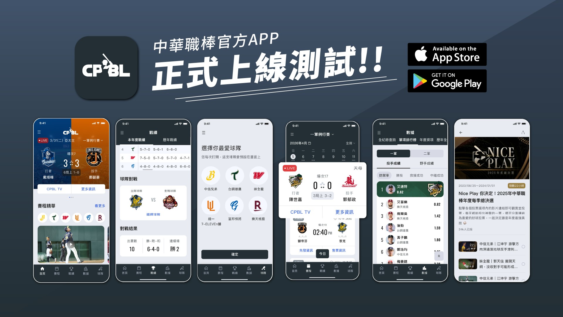 為提供球迷更即時且全面的觀賽體驗,中華職棒官方APP於今(17)日正式上線測試,將進行為期一個月的試運行。官方APP整合多元功能,除基本賽程、戰績與數據查詢外,更導入「賽事推播」與「互動式數據分析」,全面升級數位觀賽體驗,打造嶄新的沉浸式棒球服務,讓球迷無論身在何處,都能隨時掌握最新賽事動態。APP在試營運期間將持續優化調整,期盼提供球迷更完整、優質的數位觀賽體驗。