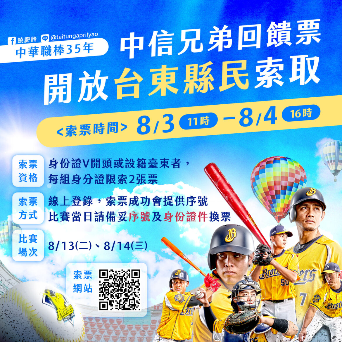 饒慶鈴縣長表示,特別高興台東今年共舉辦八場職棒賽事,自2022年起中華職棒睽違14年再度重返台東,近年縣府編列預算及爭取中央補助經費整建球場以優化提升比賽整體環境,讓鄉親能夠每年在台東有職業賽事可以觀賞。另國內棒球好手很多都來自台東,球員的親友及關心棒球的鄉親能夠避免舟車勞頓至外縣市觀看比賽;縣府為服務鄉親將中信兄弟回饋票券在8月3日(星期六)上午11點起到4日下午4點止開放「身份證字號V」及「設籍台東」的民眾上網免費登記索取兌換票券序號(每組身分證字號限登記1場次,可索2張票),請鄉親準時上線登記索完為止。