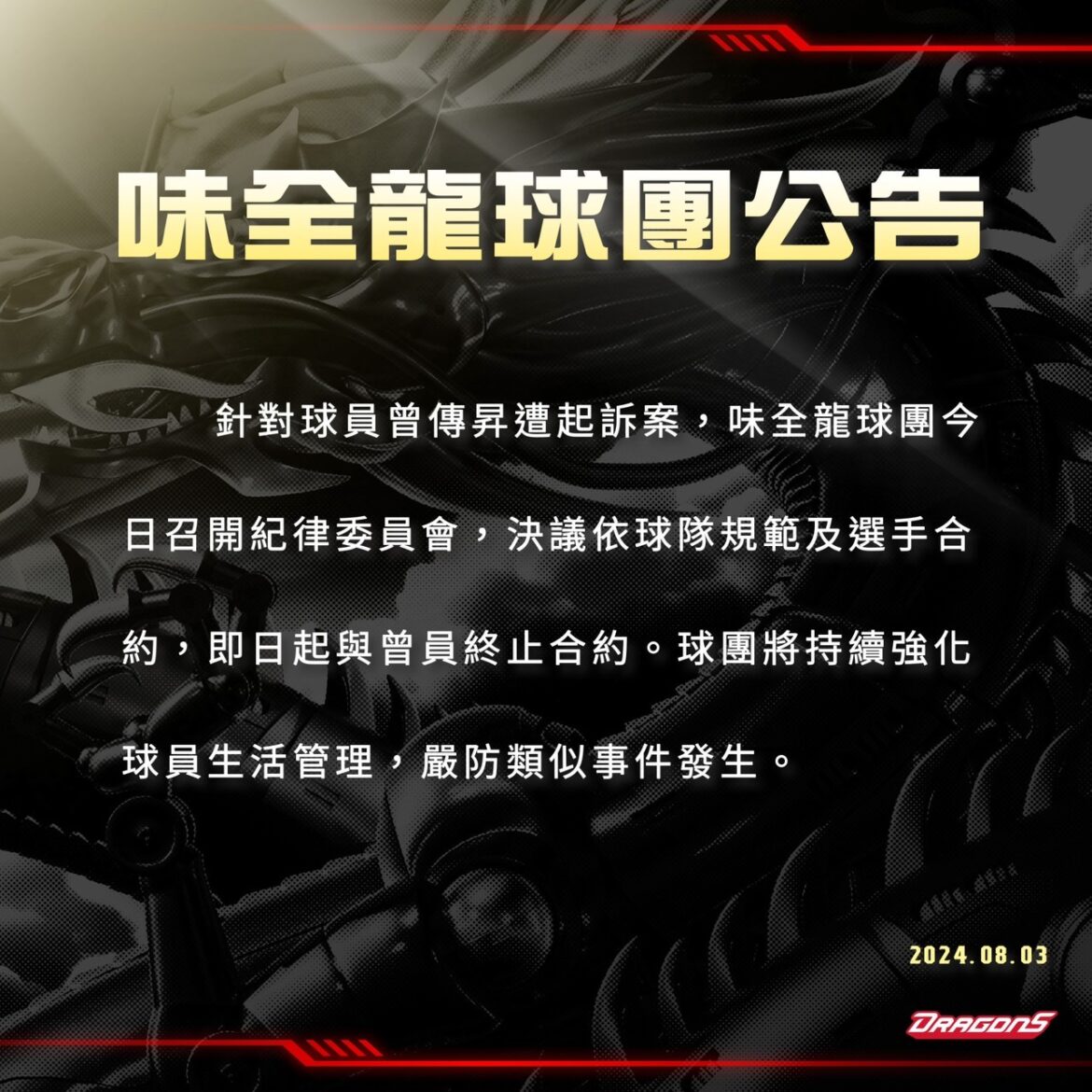 針對味全球員曾傳昇遭起訴案,味全龍球團今日召開紀律委員會,決議依球隊規範及選手合約,即日起與曾員終止合約。球團將持續強化球員生活管理,嚴防類似事件發生。