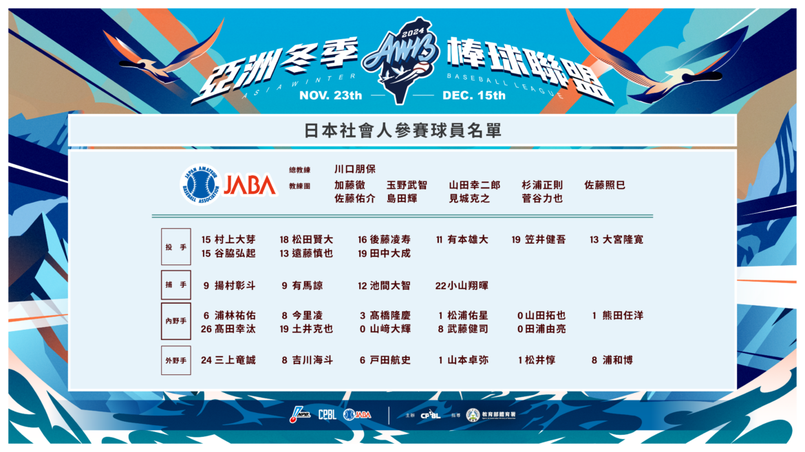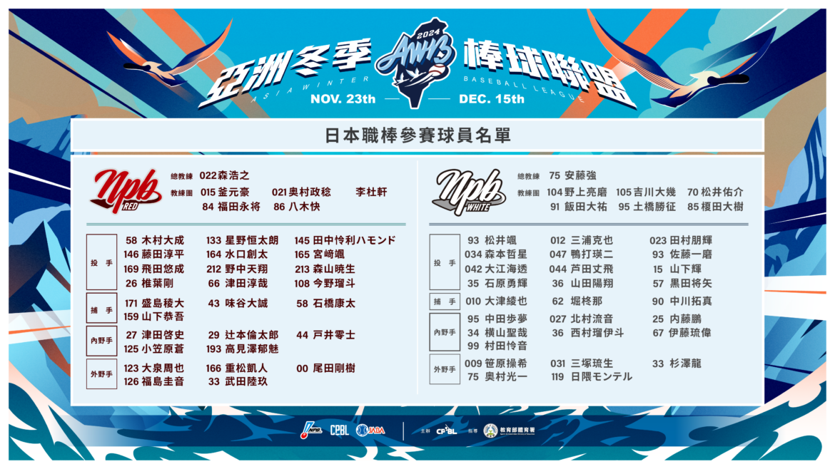 2024亞洲冬季棒球聯盟將於11月23日開打,中職派出兩隊分別為台灣山林、台灣海洋,日本則有日職紅隊、日職白隊及日本社會 …