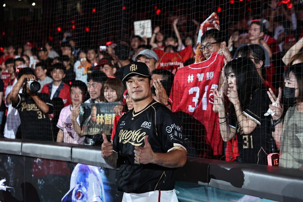 9月7日在台北大巨蛋的生涯職棒選手最後一場比賽,43歲的味全龍「大師兄」林智勝在6局下從台鋼雄鷹後援投手許育銘手中敲出生 …